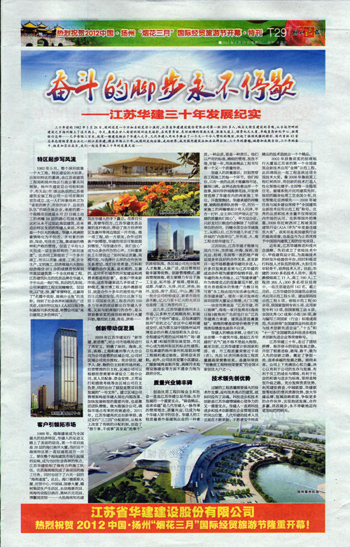 《揚州晚報》專版刊發公司三十周年宣傳文章 時間:2012-04-19 5974 4月18日,《揚州晚報》T29版刊發專版文章《奮斗的腳步永不停歇——江蘇華建三十年發展紀實》,從公司起步、市場開拓、創新發展、質量與科技等各個層面,介紹了公司三十年的奮斗歷程、綜合實力和發展業績。