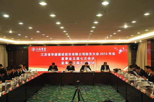 427日下午,江蘇省華建建設股份有限公司股東大會2013年會暨董事會、監事會五屆七次會議在揚州召開。會議由陸金龍董事長主持,10名股東代表、11名董事、4名監事出席會議,公司高級管理人員、各分支機構和總部各部室負責人、公司律師團代表列席會議。會議聽取和審議通過了副董事長、總經理宗有農同志所作的董事會和經營層工作報告,監事會主席吳士茂所作的監事會工作報告,公司總會計師李長棟同志所作的《關于2012年度財務決算和2013年度財務預算方案的報告》和《關于2012年度股利分配方案的報告》。