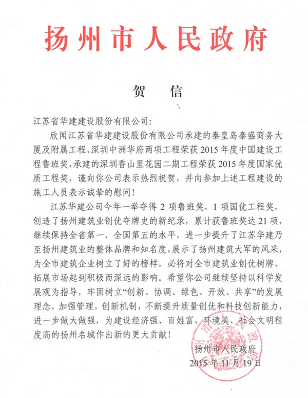 揚(yáng)州市政府向江蘇華建發(fā)來賀信 祝賀一年內(nèi)獲三項(xiàng)國家質(zhì)量大獎(jiǎng)