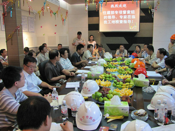 住建部建筑施工安全專項督查組檢查指導廣西麗原•天際城項目 時間:2010-10-14 5162 9月18日上午,國家住房城鄉建設部建筑施工安全專項督查組蒞臨我公司廣西麗原·天際城工地檢查指導工作,勘察了施工現場的實體安全狀況,查閱了施工質量安全技術資料,檢查了我公司的資質、安全許可、三類人員與特種作業人員持證的情況。項目部的安全防護與文明施工工作受到了督查組的一致好評,住建部工程質量安全監管司王樹平副司長在知道我們爭創“魯班獎”的情況后,提出了許多寶貴的意見,并預祝我們的質量目標得以圓滿實現。 另訊,此前麗原·天際城工程項目被評為2010年上半年廣西自治區文明工地。