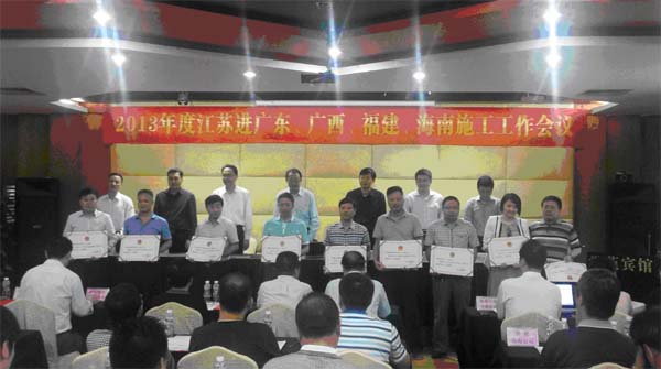 海南分公司榮獲2013年江蘇進粵、桂、閩、瓊施工先進企業 時間:2014-04-28 3844 4月25日,2013年度江蘇進廣東、廣西、福建、海南施工工作會議在珠海市市委黨校學苑賓館召開。會上,海南分公司榮獲“2013年江蘇進粵、桂、閩、瓊施工先進企業”,高家馴被表彰為“2013年江蘇進粵、桂、閩、瓊施工優秀企業經理”,1人被評為優秀建造師、2人分別被評為質量安全和經營財務管理先進個人。 另訊:4月19日,從中國施工企業管理協會第29次年會傳來喜訊,海南公司匡新益被評為2013年度“全國工程建設優秀項目經理”。