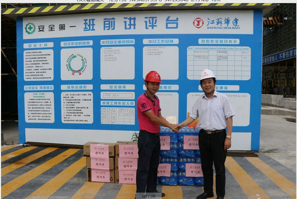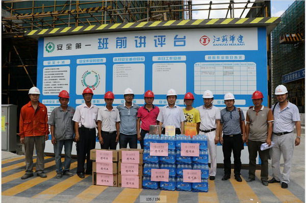 區域公司領導赴三亞工地進行高溫慰問 時間:2015-06-20 3181 6月19日上午,海南分公司黨總支副書記沈巨青帶隊,在分公司工會代表等相關部門陪同下,走訪慰問了三亞婦幼保健院項目部,看望了堅守崗位奮戰在高溫一線的項目部人員,并給他們送去了礦泉水、洗漱用品和防暑藥品。 慰問組一行實地了解項目部的進展情況以及現場人員的食、住、行、業務學習安排等情況,叮囑大家在高溫季節要切實加強現場管理,繃緊安全弦,確保平穩有序生產。