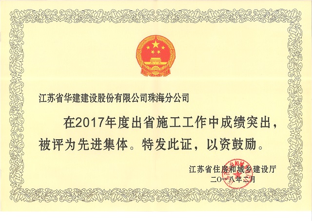 公司獲評“2017年度江蘇出省施工先進集體”