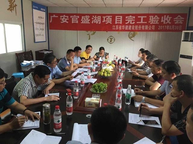 華建第一壩——官盛湖大壩工程順利通過完工驗收 時間:2017-07-03 3724 6月30日上午,華建首個水利項目——官盛湖大壩工程完工驗收會在項目會議室召開,廣安官盛新區管委會副主任蔣成文主持會議。經項目勘察、設計、監理、區住建局、質監站、水務局、發改局、財政局等單位和業主現場代表實測檢查、分別總結匯報后,一致同意工程驗收合格。 官盛湖大壩作為一項以城市景觀為主、兼有防洪功能的綜合性水利工程,主要由樞紐工程、泄洪渠工程組成。官盛湖湖區總庫容987.73萬立方米,壩頂長349米,最大壩高48.5米,壩體填筑總量達157.93萬方。