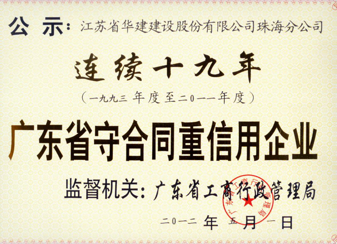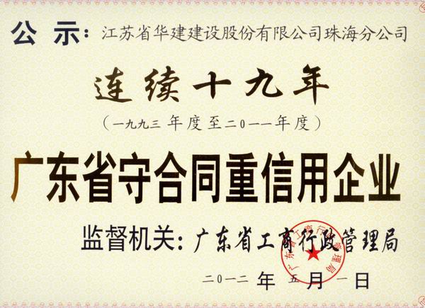 珠海公司連續19年榮獲“廣東省守合同重信用企業”榮譽稱號 時間:2012-06-28 5787 珠海公司連續19年榮獲“廣東省 守合同重信用企業”榮譽稱號 五月份珠海分公司被廣東省工商行政管理局授予“連續十九年廣東省守合同重信用企業”榮譽稱號。