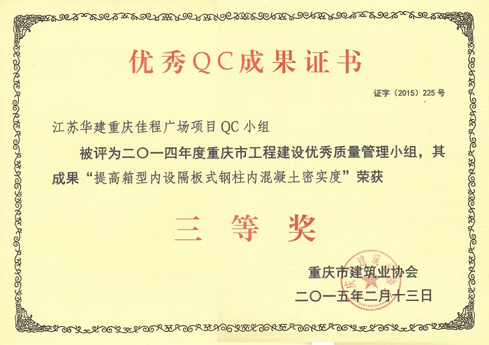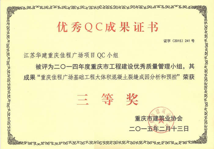 公司3項QC成果榮獲重慶市三等獎 時間:2015-04-02 4650 近日,重慶市建筑業協會發文表彰了一批優秀QC成果,公司重慶佳程廣場項目QC小組被評為2014年度重慶市工程建設優秀質量管理小組,其成果“提高箱型內設隔板式鋼柱內混凝土密實度”、“剝蝕丘陵地貌多形截面鋼筋混凝土灌注樁施工新方法”、“重慶佳程廣場基礎工程大體積混凝土裂縫成因分析和預控”等均榮獲三等獎。