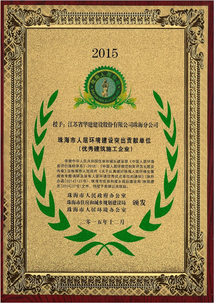 公司榮獲珠海市人居環境建設突出貢獻單位等四項表彰 時間:2015-12-22 4281 近日,珠海公司被珠海市人民政府辦公室、珠海市住房和城鄉規劃建設局和珠海市人居環境辦公室聯合表彰為珠海市人居環境建設突出貢獻單位(優秀建筑施工企業),繆國樞總經理被授予珠海市人居環境建設突出貢獻個人稱號,由我公司承建的拱北海關業務技術綜合樓及南福·錦園項目榮獲中國人居環境范例獎優秀試點項目(優秀示范工程)。