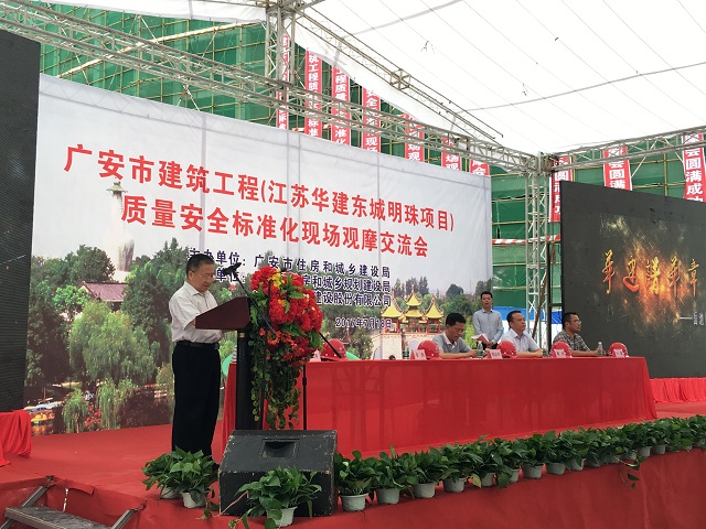 7月18日上午,廣安市2017年建筑工程質(zhì)量安全標(biāo)準(zhǔn)化施工現(xiàn)場觀摩會在我司東城明珠項目召開,廣安市住建局總工程師劉運(yùn)舉、岳池縣副縣長楊偉和公司總部領(lǐng)導(dǎo)程杰、吳士茂、重慶分公司總經(jīng)理嚴(yán)正濤、副總經(jīng)理龐文榮、田大浪等參加會議。