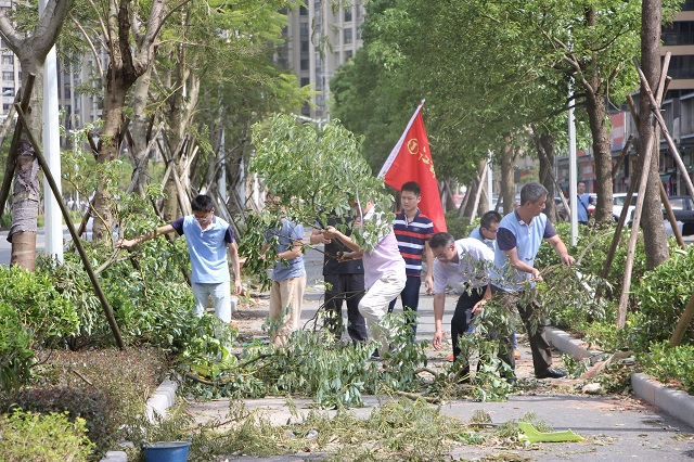 中午11時開始,臺風臨近,狂風暴雨橫掃珠海,中午13時許,臺風中心正面登陸珠海,出現了短暫的平靜。公司隨即指示各項目部不得松懈,所有人員不得離開安全區域。緊接著,臺風再次肆掠。14時許,金灣區停水、停電、通訊中斷。23日下午,在經歷過臺風的侵襲后,珠海道路樹木大片倒伏,交通基本癱瘓。公司利用偶有通訊信號的機會聯系各項目部確認受災情況。因部署及時,本次臺風并未造成人員傷亡。