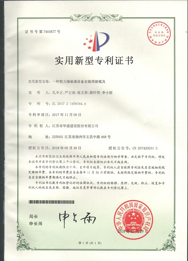 近日,從國家知識產(chǎn)權(quán)局傳來喜訊,公司申請的《一種剪力墻嵌墻設(shè)備安裝預(yù)留模具》獲得實用新型專利授權(quán)。