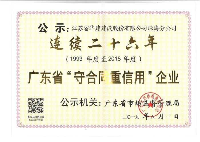 公司連續二十六年被廣東省市場監督管理局表彰為“守合同重信用企業” 時間:2019-07-01 3296 近日,珠海分公司被廣東省市場監督管理局(原公示機關為廣東省工商行政管理局)授予“連續二十六年守合同重信用企業”榮譽稱號。