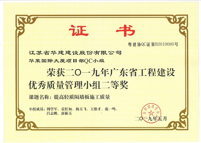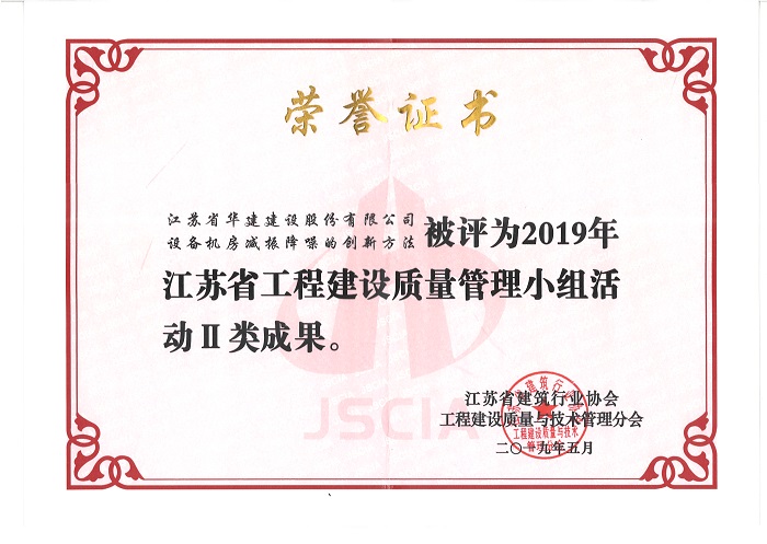 華策國(guó)際大廈項(xiàng)目部QC小組“設(shè)備機(jī)房減振降噪的創(chuàng)新方法”成果在江蘇省建筑業(yè)協(xié)會(huì)組織的2019年度江蘇省工程建設(shè)質(zhì)量管理小組活動(dòng)中榮獲二等獎(jiǎng)。