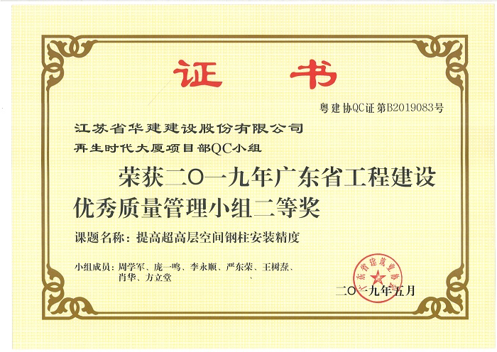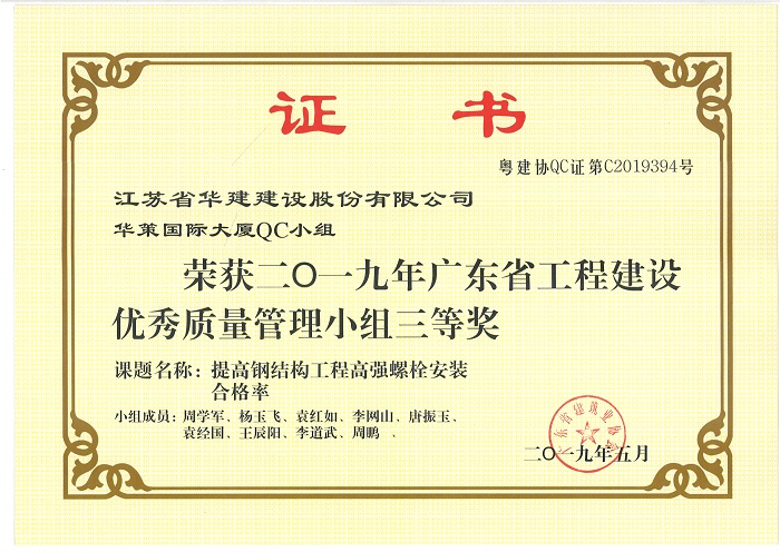 近期,廣東省建筑業(yè)協(xié)會(huì)發(fā)文公布了2019年度廣東省工程建設(shè)優(yōu)秀質(zhì)量管理小組名單,公司華策國(guó)際大廈項(xiàng)目部QC小組“提高輕質(zhì)隔墻板施工質(zhì)量”、再生時(shí)代項(xiàng)目部QC小組“提高超高層空間鋼柱安裝精度”兩項(xiàng)成果喜獲二等獎(jiǎng),華策國(guó)際大廈項(xiàng)目部QC小組“提高鋼結(jié)構(gòu)工程高強(qiáng)螺栓安裝合格率”榮獲三等獎(jiǎng)。