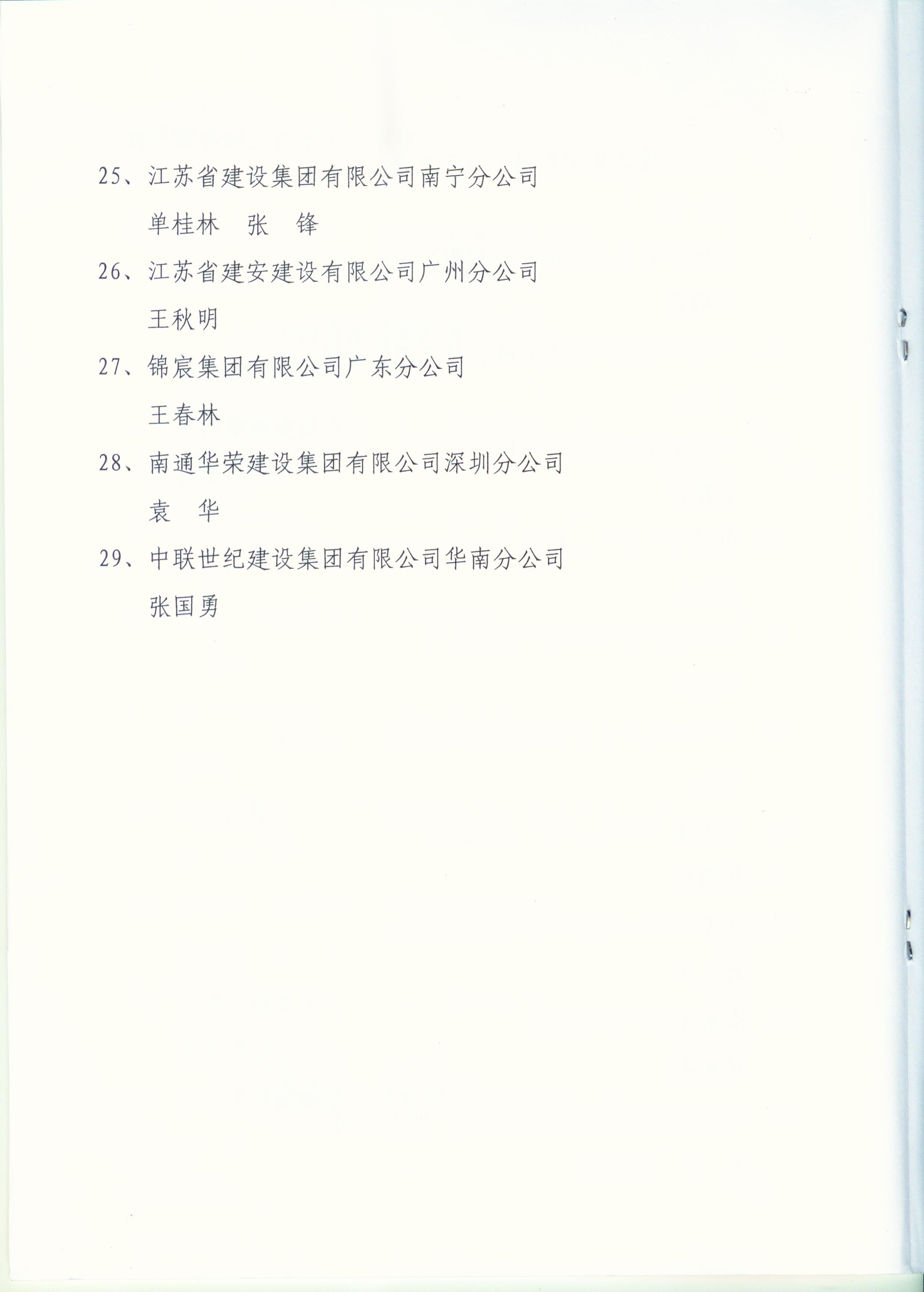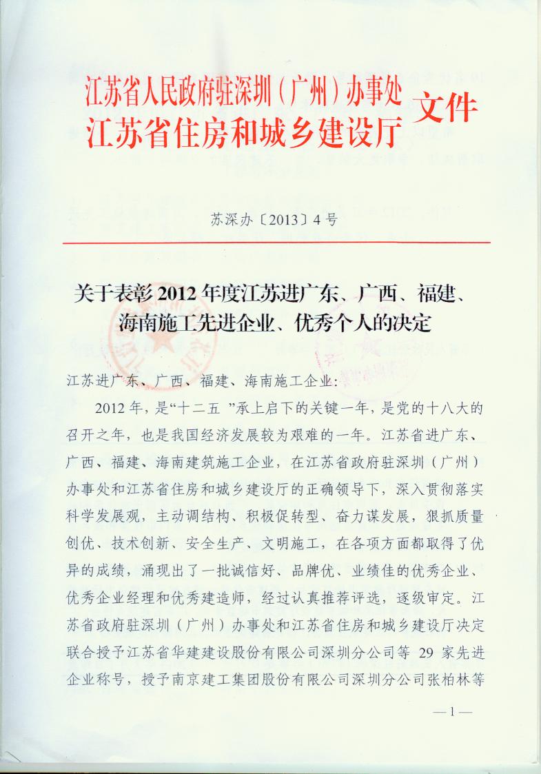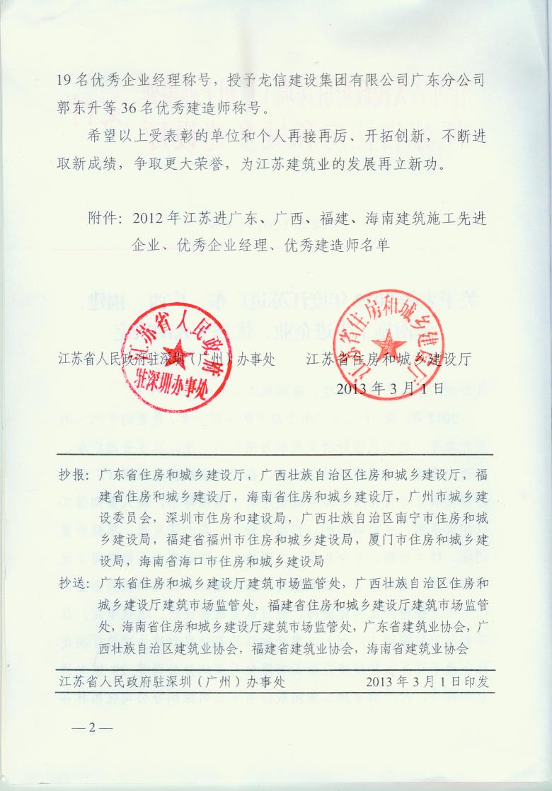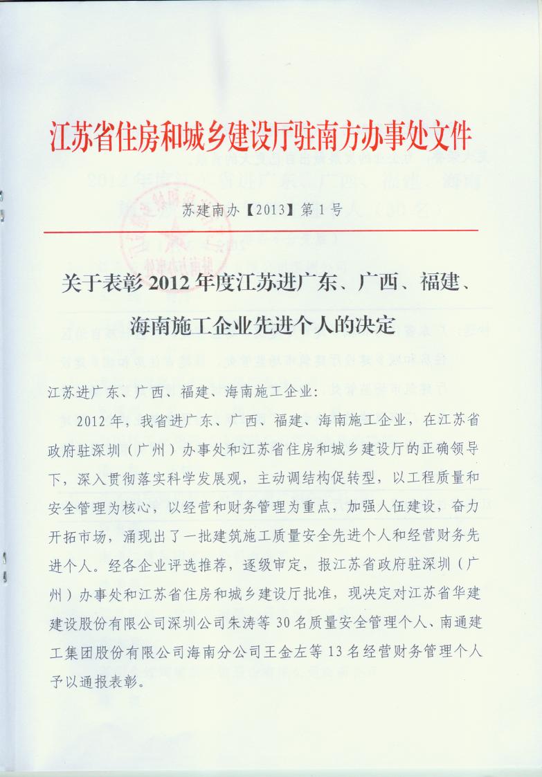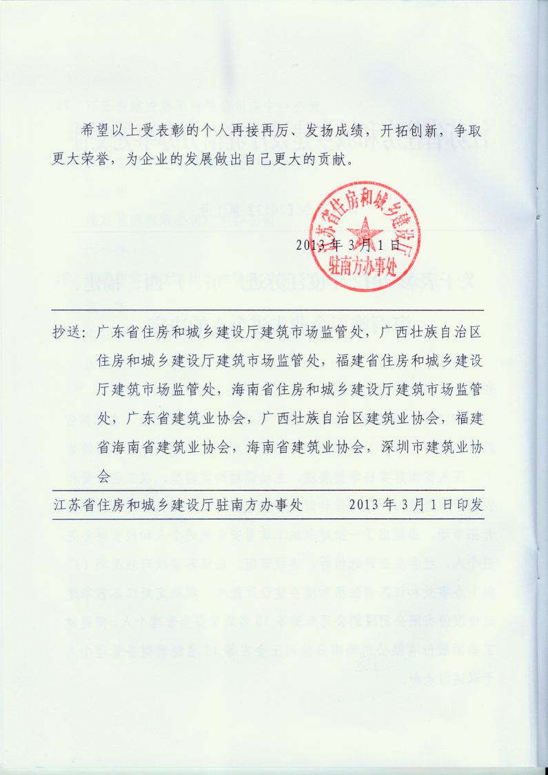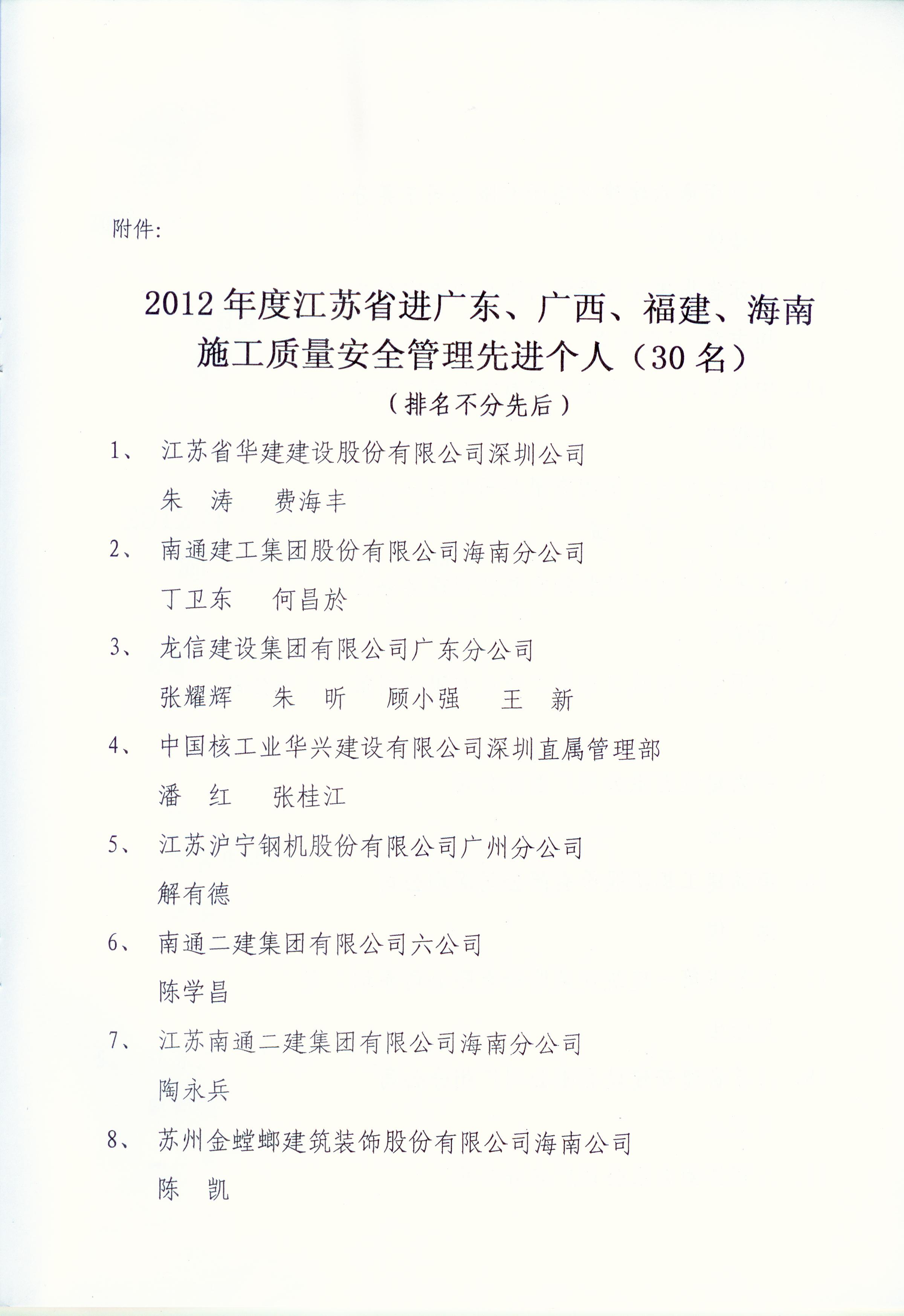 2012年江蘇進粵、桂、閩、瓊建筑施工先進企業、優秀企業經理、優秀建造師及經營財務管理、質量安全管理先進個人