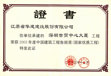 招商銀行大廈工程1998年6月18日開工,2001年9月29日竣工,觀感得分91.9分,評定為“優(yōu)良工程”;先后榮獲深圳市優(yōu)質(zhì)樣板工程“金牛獎”、江蘇省優(yōu)“揚子杯”、廣東省優(yōu)良樣板工程,2003年榮獲“中國建筑工程魯班獎”。