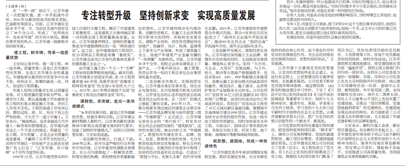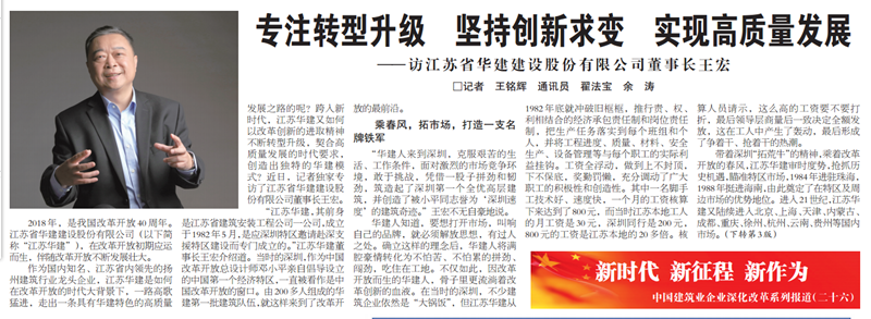 王宏董事長接受《建筑時報》專訪:專注轉型升級,堅持創新求變,實現高質量發展 時間:2018-09-11 4123 9月10日,《建筑時報》頭版及微信公眾號對王宏董事長的專訪給予了刊載。 王宏董事長在專訪中就江蘇華建成立36年來,是如何在改革開放的時代大背景下,走出一條具有華建特色的高質量發展之路,跨入新時代,江蘇華建又是如何以改革創新的進取精神不斷轉型升級,契合高質量發展的時代要求,創造出獨特的華建模式進行了詳細介紹。